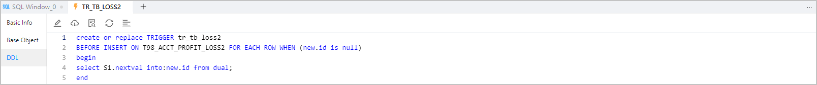To go to the trigger editing page, right-click the target trigger in the trigger list and choose Edit from the shortcut menu that appears. You can also click the Edit button on the DDL tab of the trigger management page to go to this page. The code area on the editing page displays the statements that define the trigger. You can edit the statements. In addition, the toolbar provides the following buttons: