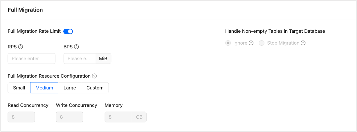 Full Migration Resource Configuration You can select Small, Medium, or Large to use the corresponding default values of Read Concurrency, Write Concurrency, and Memory. You can also customize the resource configurations for full migration. By setting the resource configuration for the Full-Import component, you can limit the resource consumption of a task in the full migration phase. Notice